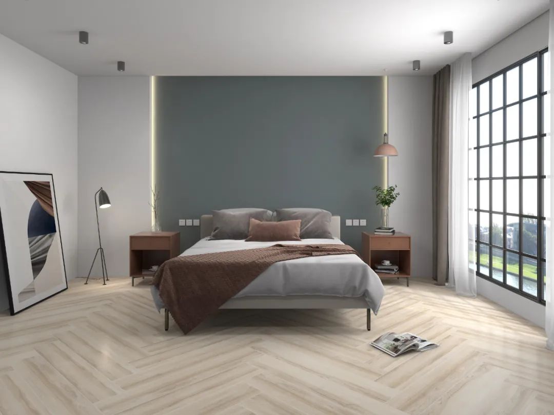 現代風格設計的臥室,白色、霧霾藍、原木色搭配出的睡眠環境輕松舒適,同時能夠帶來更加健康的睡眠狀態。
