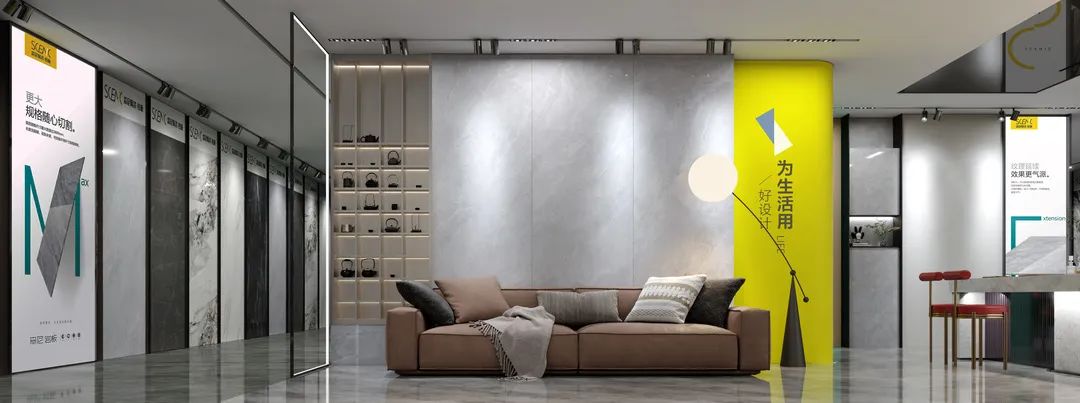 雅灰立定空間調(diào)性,檸檬 黃為雅灰注入鮮亮澄澈,展示出森尼陶瓷·巖板的時尚和活力。