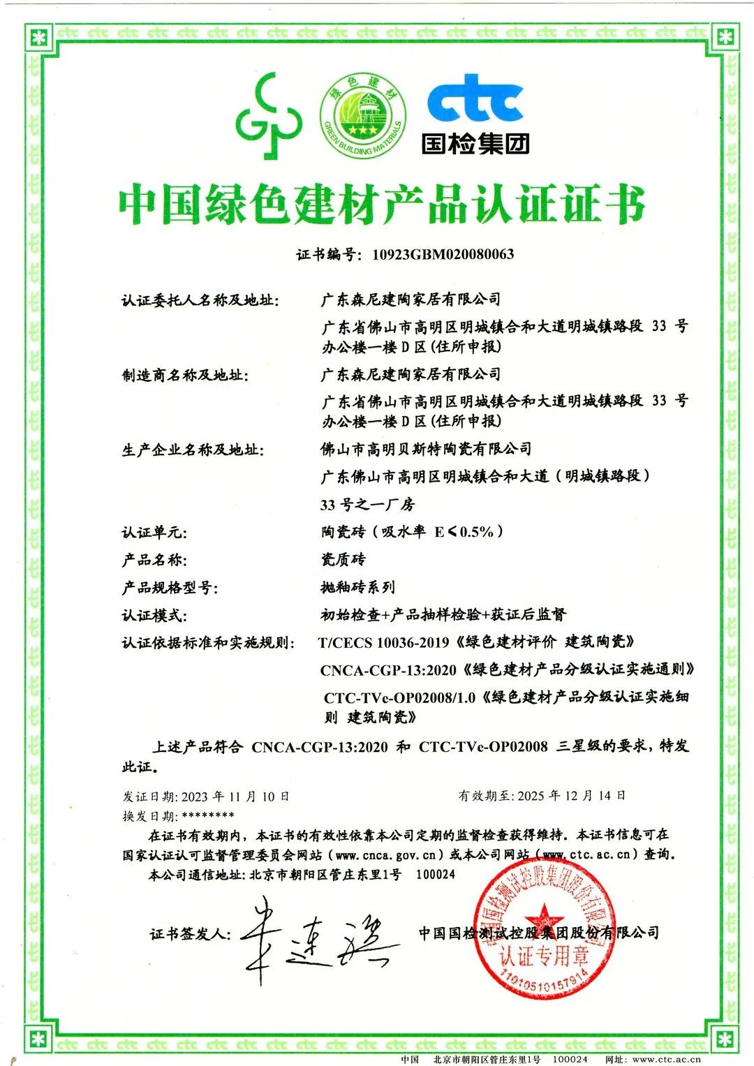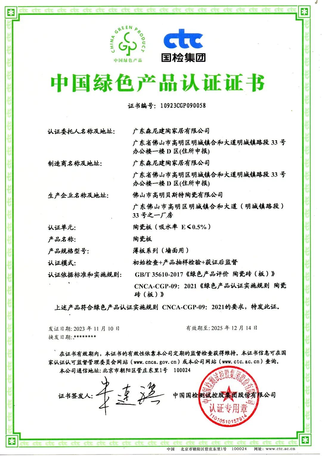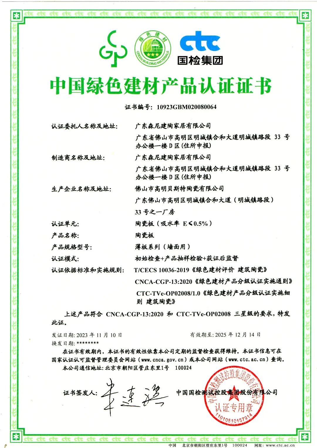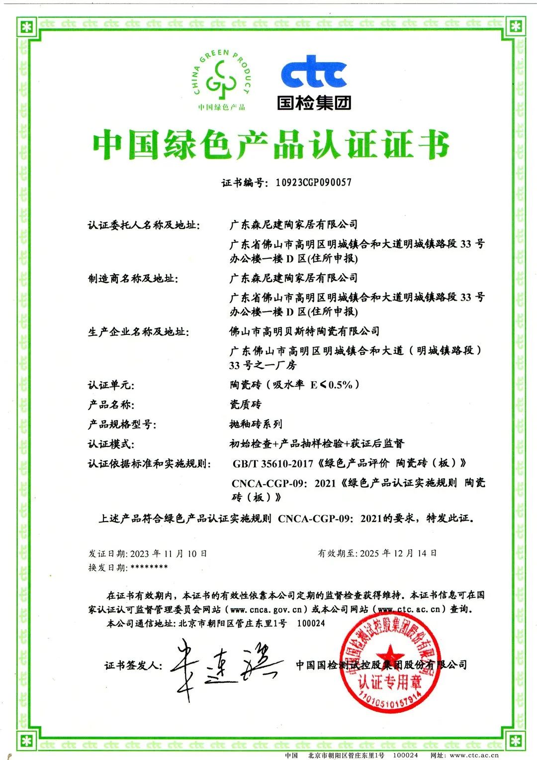 森尼陶瓷板產品符合綠色產品認證實施規則 CNCA-CGP-09:2021的要求;森尼瓷質磚產品符合CNCA-CGP-13:2020 和 CTC-TVe-OP02008 三星級的要求。