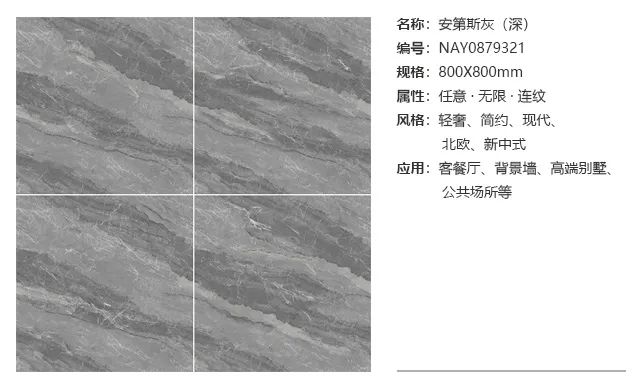 ? 安第斯灰(深)NAY0879321連紋展示效果安第斯灰(深)連紋磚將自然之景融入到產品,與自然流暢的紋理相互融合,質感與美觀兼具,淡雅輕奢空間呼之欲出。